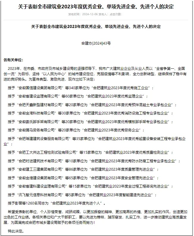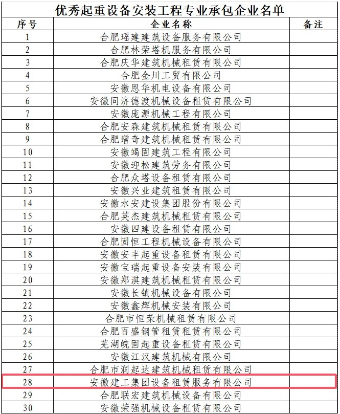 喜事連連,在合肥市建筑工程協(xié)會(huì)發(fā)布的《關(guān)于表彰全市建筑業(yè)2023年度優(yōu)秀企業(yè)、單項(xiàng)先進(jìn)企業(yè)、先進(jìn)個(gè)人的決定》中,建工設(shè)備租賃獲得“合肥建筑業(yè)2023年度優(yōu)秀起重設(shè)備安裝工程專業(yè)承包企業(yè)”稱號(hào)。