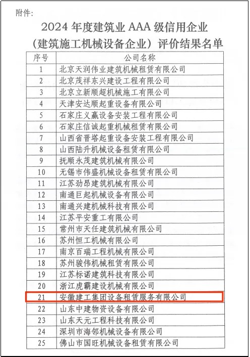 近日,中國(guó)建筑業(yè)協(xié)會(huì)建筑安全與機(jī)械分會(huì)公布了2024年度建筑業(yè)AAA級(jí)信用企業(yè)(建筑施工機(jī)械設(shè)備企業(yè))評(píng)價(jià)結(jié)果,建工設(shè)備租賃成功入選,成為安徽省唯一一家“2024 年度建筑業(yè)AAA級(jí)信用企業(yè)(建筑施工機(jī)械設(shè)備企業(yè))”。