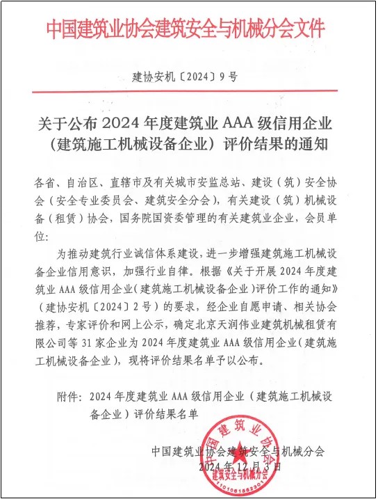 近日,中國(guó)建筑業(yè)協(xié)會(huì)建筑安全與機(jī)械分會(huì)公布了2024年度建筑業(yè)AAA級(jí)信用企業(yè)(建筑施工機(jī)械設(shè)備企業(yè))評(píng)價(jià)結(jié)果,建工設(shè)備租賃成功入選,成為安徽省唯一一家“2024 年度建筑業(yè)AAA級(jí)信用企業(yè)(建筑施工機(jī)械設(shè)備企業(yè))”。